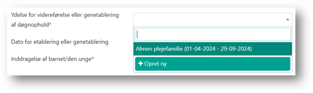 I feltet ’Ydelse for videreførelse eller genetablering af døgnophold’ skal du indsætte ydelsen vedr. døgnopholdet. Du kan enten vælge mellem ydelser, som allerede er oprettet på sagen eller du kan oprette en ny ydelse ved at klikke på 'Opret ny’. Hvis du ikke kender fx startdato eller anbringelsessted endnu, kan du tilknytte en ydelse i status kladde, og når du kender oplysninger, tilpasser du ydelsen og godkender den. DUBU indberetter først, når aktiviteten er gemt som udført og ydelsen er gemt som godkendt.