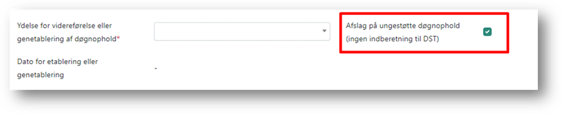Du kan også anvende aktiviteten ’Afgørelse’ – ’Ungestøtte døgnophold, § 114, 116 eller 120’, når der gives afslag på ungestøtte døgnophold. I dette tilfælde skal du markere specialfeltet ’Afslag på ungestøtte døgnophold (ingen indberetning til DST)’.
